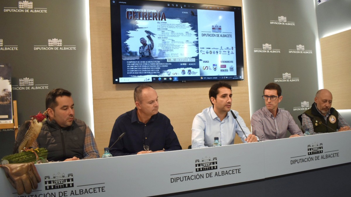 La provincia de Albacete continúa atrayendo actividades deportivas del máximo nivel de la mano de la Diputación, tal y como se ha puesto de relieve durante la presentación del Campeonato de España de Cetrería, que se celebrará en La Roda del 8 al 10 de diciembre, una cita que ya acogió la localidad en 2021 y cuya ‘puesta de largo’ este jueves ha coincidido con el Día Mundial de la Cetrería.