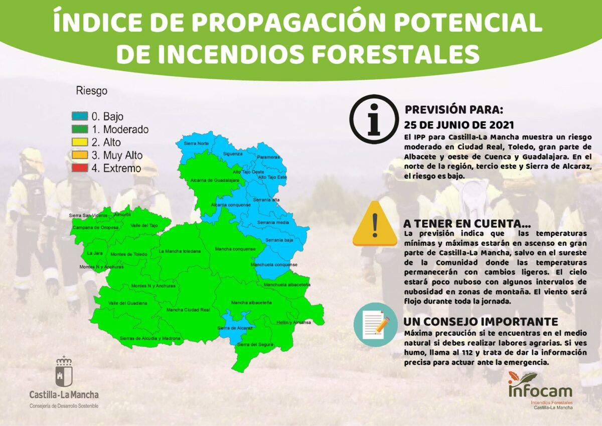 Los incendios forestales suponen una amenaza importante en el paisaje de Castilla-La Mancha favorecidos en su mayor parte por una vegetación inflamable y unas condiciones meteorológicas específicas: las altas temperaturas y la sequía. Cabe recordar que el periodo de riesgo alto de incendios forestales en la región comprende del 1 de junio al 30 de septiembre y que el 90% de los incendios forestales están originados por la mano del hombre, por accidentes, descuidos o malas prácticas.