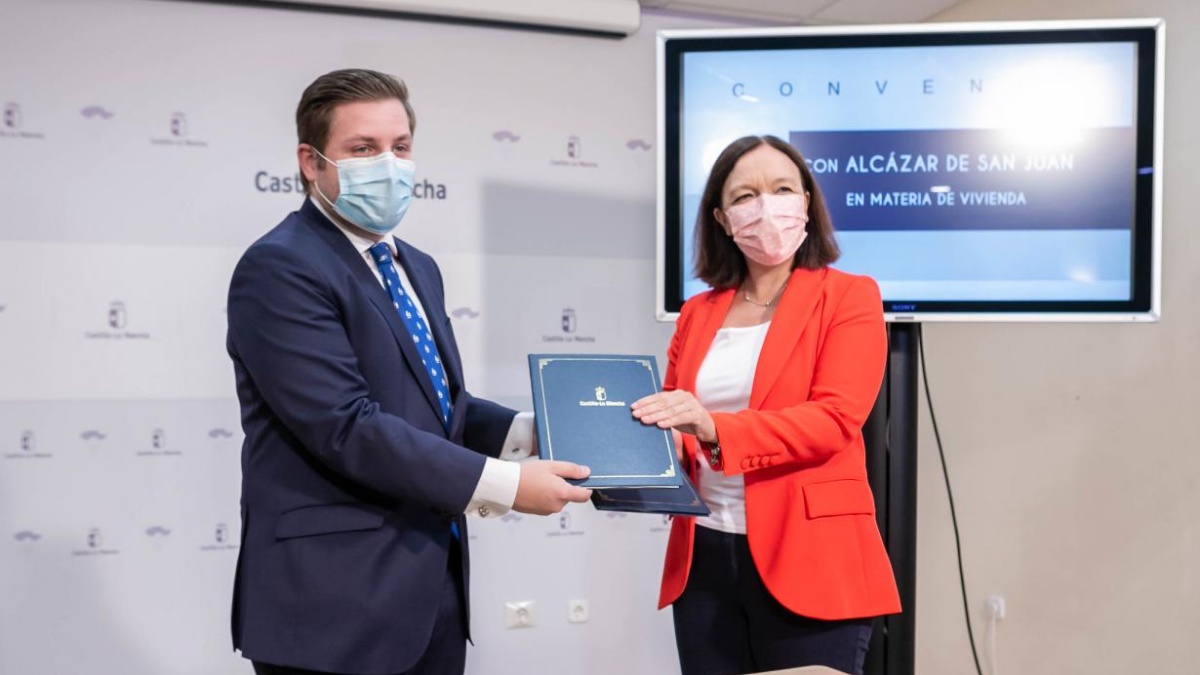 El consejero de Fomento ha firmado junto con la alcaldesa de Alcázar de San Juan, Rosa Melchor, el convenio de cesión de seis viviendas y un local en el barrio de ‘Pradera’, en un acto al que también han asistido la directora general de vivienda, Inés Sandoval; y el vicepresidente segundo de la Diputación de Ciudad Real, Gonzalo Redondo.