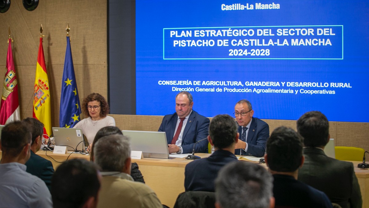La Consejería de Agricultura, Ganadería y Desarrollo Rural ha presentado esta mañana el Plan Estratégico del Pistacho de Catilla-La Mancha 2024-2028, un proyecto “fundamental que nos va a permitir tener una línea de trabajo clara respecto a este importante cultivo, realizada de forma conjunta con el sector” y que ha sido elaborado junto a Cooperativas Agroalimentarias de Castilla-La Mancha.
