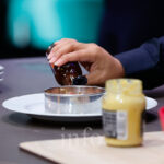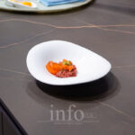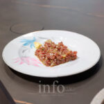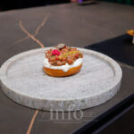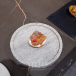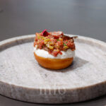 Como toque innovador, reemplazó el pepinillo típico por berenjena de Almagro con DOP y sirvió el tartar sobre un donut ligeramente dulzón con glaseado de mantequilla ahumada y trufa de Cifuentes, logrando un equilibrio entre tradición y creatividad. Completó el plato con chalota, piñones, piparras, cebollino, pétalo de flor y una lámina de trufa, manteniendo siempre la temperatura adecuada gracias a un baño maría invertido.