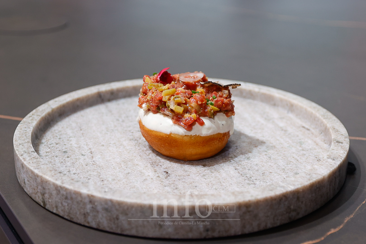 Como toque innovador, reemplazó el pepinillo típico por berenjena de Almagro con DOP y sirvió el tartar sobre un donut ligeramente dulzón con glaseado de mantequilla ahumada y trufa de Cifuentes, logrando un equilibrio entre tradición y creatividad. Completó el plato con chalota, piñones, piparras, cebollino, pétalo de flor y una lámina de trufa, manteniendo siempre la temperatura adecuada gracias a un baño maría invertido.