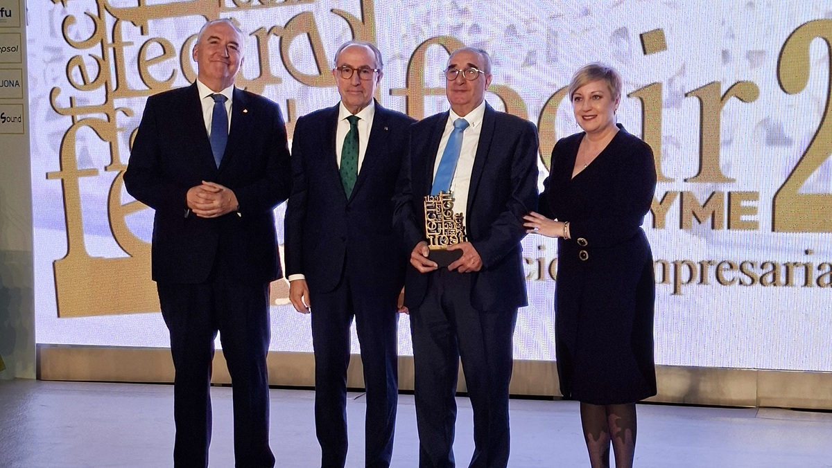 Mariano León, presidente de Globalcaja, ha tenido ocasión de participar en la entrega del Premio a la Trayectoria Empresarial 2025, que ha recaído en Hermanos Chacón S.A., empresa regida por Julio y Antonio Chacón, quienes desde Bolaños de Calatrava destacan por haber dado continuidad y ampliado el negocio familiar de frutos secos y patatas fritas que fundaron sus progenitores hace más de 60 años.