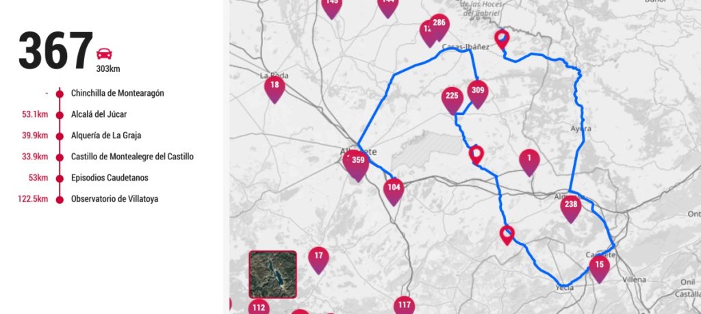 Otro de los itinerarios que permite descubrir y disfrutar del patrimonio de la provincia de Albacete a lo largo de 303 kilómetros arranca en Chinchilla de Montearagón, a pocos kilómetros de la capital albaceteña, pasando por Alcalá del Júcar hasta el Castillo de Montealegre y finaliza la ruta en el Observatorio de Villatoya.