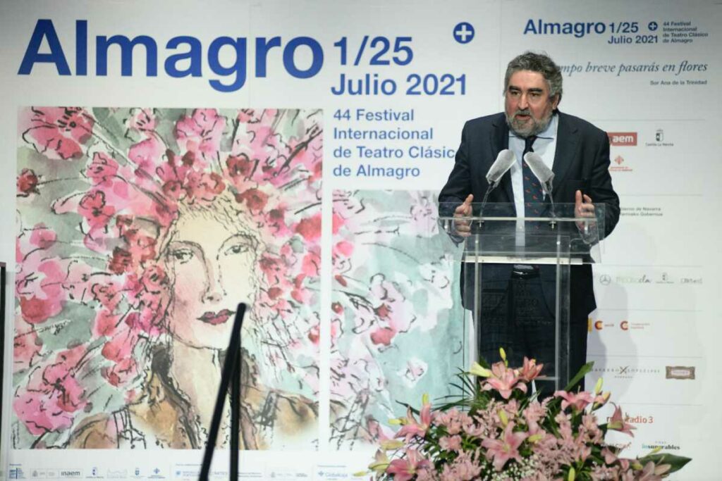 García ha querido que sus primeras palabras fueran en recuerdo a las personas “que han trabajado y trabajan incansablemente en el cuidado de los demás en este difícil tiempo, y a quienes nos han curado, cuidado y ahora vacunado…”. Posteriormente, el director del Festival ha afirmado que Almagro “es un espacio de convivencia único, un espacio feminista, americanista, accesible e inclusivo, y este año también Ibérico”, pues Portugal será este año el País Invitado de Honor y animó a todos a construir juntos un futuro tan “luminoso y florido”, como el cartel y el lema de este festival.