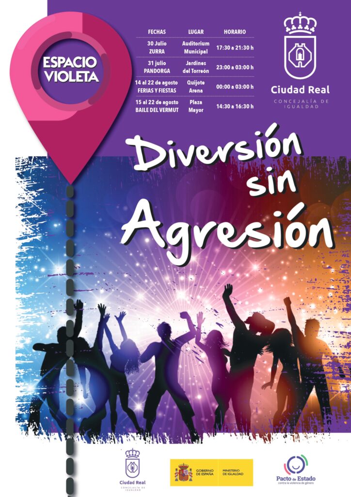 La concejalía de Igualdad del Ayuntamiento de Ciudad Real ha puesto en marcha la campaña “Diversión sin agresión”. Una iniciativa que se plasmará con los “Espacios Violeta” que van a estar activos en las próximas fiestas de la Pandorga y la Feria de agosto, que tienen el objetivo de informar, sensibilizar, proteger y prevenir contra agresiones sexistas y que están dirigidos a toda la ciudadanía.