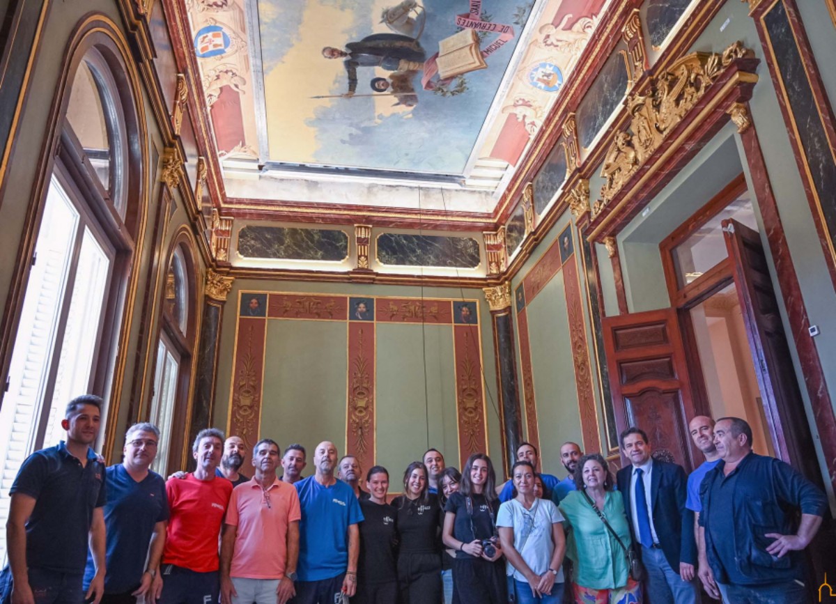 El lienzo del Quijote de Ángel Andrade ocupa desde hoy su emplazamiento originario en el techo del Salón de Recepciones del Palacio de la Diputación de Ciudad Real. Algo más de diecisiete meses han transcurrido entre el desafortunado desprendimiento de parte del techo de la citada estancia, ubicada en la parte noble del edificio, y el emotivo momento que se ha vivido esta mañana en la sede de la institución provincial, cuando la obra del que fuera uno de los mejores paisajistas de su época ha sido depositada en la estructura en la que quedará anclada independiente del resto de los elementos arquitectónicos del edificio.