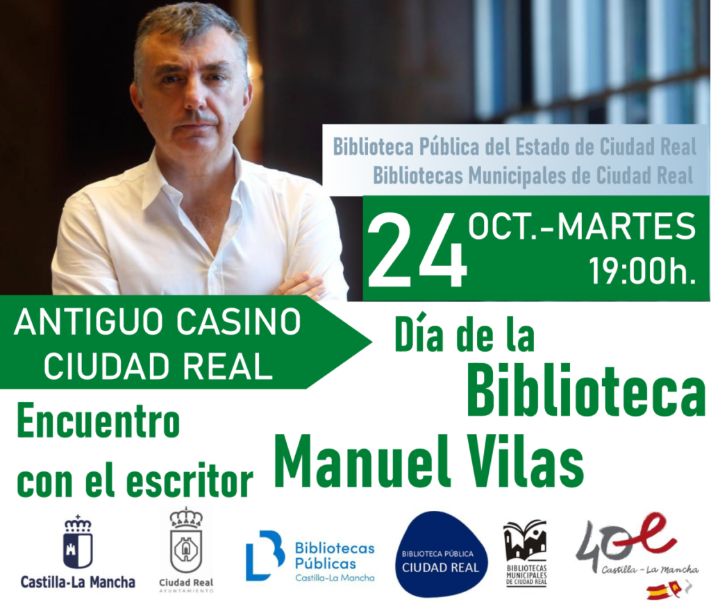 El acto central de la semana, tendrá lugar mañana día 24, Día de la Biblioteca, en donde en colaboración con la Biblioteca Pública del Estado y Editorial Planeta, a las 19:00 horas en el Salón de Conciertos del Antiguo Casino, tendrá lugar el Encuentro Literario con el último Premio Nadal, el escritor Manuel Vilas, a él asistirán los lectores de los Clubs de Lectura Municipales y los de la Biblioteca Pública del Estado. Entrada libre hasta completar aforo.