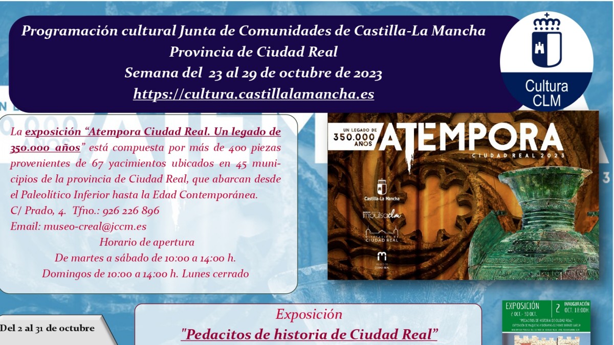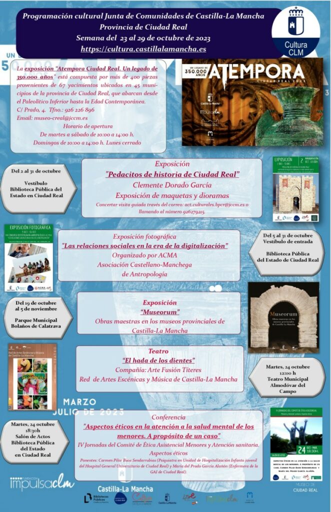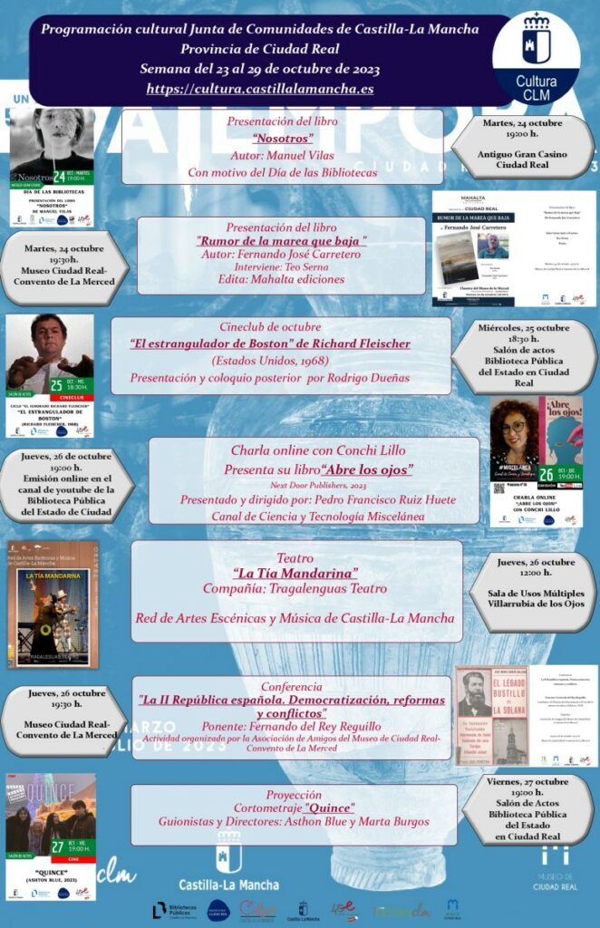 El Gobierno de Castilla-La Mancha, a través de la Delegación de Educación, Cultura y Deportes en Ciudad Real, ha programado una rica variedad de actividades culturales en diversos municipios de la provincia para esta semana del lunes 23 al domingo 29 de octubre.