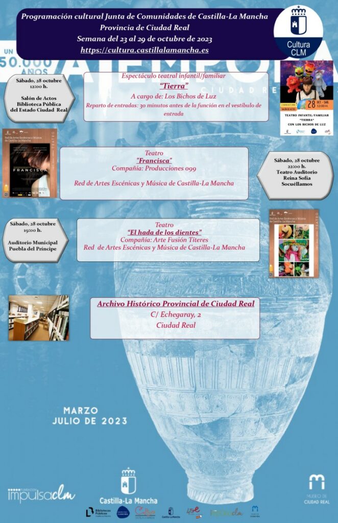 El sábado 28 de octubre a las 12:00 horas en el salón de actos de la Biblioteca Publica del Estado tendrá lugar el espectáculo teatral infantil y familiar ‘Tierra’ a cargo de Los Bichos de Luz; a las 22:00 horas la obra de teatro ‘Francisca’ de la compañía 099 producciones en el Teatro Auditorio ’Reina Sofia’ de Socuéllamos, mientras que, la obra ‘El hada de los dientes’ de Arte Fusión Títeres se representará a las 19.00 horas en el Auditorio Municipal de Puebla del Príncipe, ambas obras teatrales incluidas en la Red de Artes Escénicas y Música de Castilla-La Mancha
