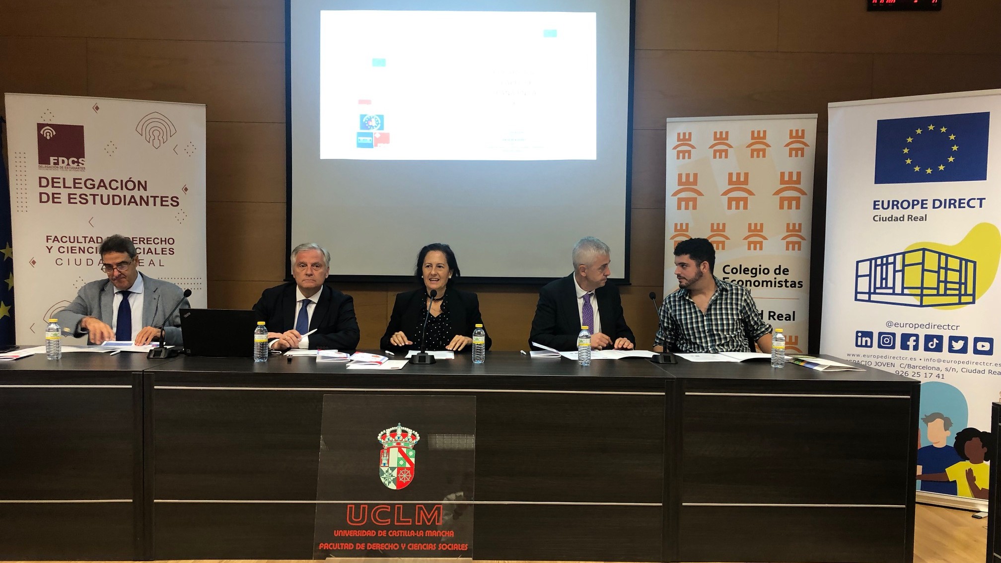 Esta mañana el alcalde de Ciudad Real, Francisco Cañizares junto al diputado nacional y catedrático de Derecho Constitucional, Enrique Belda, han inaugurado la Jornada ‘Eurocápsulas: El Papel de España en la UE’ que se celebran hoy en la Facultad de Derecho de Ciudad Real, y en la que también han intervenido Maria del Mar Moreno, secretaria académica de la Facultad de Derecho, José Antonio Negrín, decano de la Sección de Ciudad Real del Colegio Economistas de Madrid y Mario Villamor, técnico de Eurodesk Ciudad Real y Europe Direct Ciudad Real.