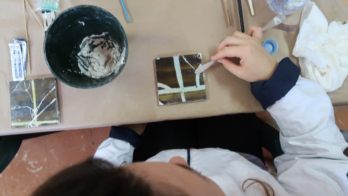 Respecto a la restauración del mural cerámico, el proceso se inicia con una investigación sobre la obra de Arcadio Blasco y la recopilación de datos sobre sus inicios en la cerámica, época en la que trabajó para Pueblonuevo y compartió espacio con otros artIstas -como José Luis Sánchez, Manuel Hernández Mompó, Jacqueline Canivet o Carmen Perujo- en las naves del actual Museo de América de Madrid; y colaboró con arquitectos de los pueblos de colonización como José Luis Fernández del Amo.