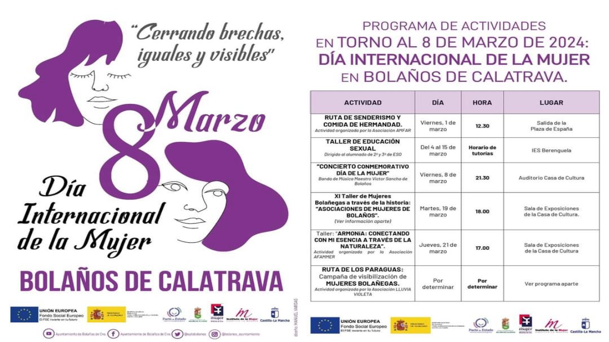 El próximo día 8 de marzo, Bolaños de Calatrava se une a la celebración global del Día Internacional de la Mujer bajo el inspirador lema «Cerrando Brechas, Iguales y Visibles». Es un momento para reflexionar sobre los avances logrados, pero también para reconocer los desafíos que aún enfrenta la mujer en la búsqueda de la igualdad de género y el empoderamiento de todas y cada una de ellas.