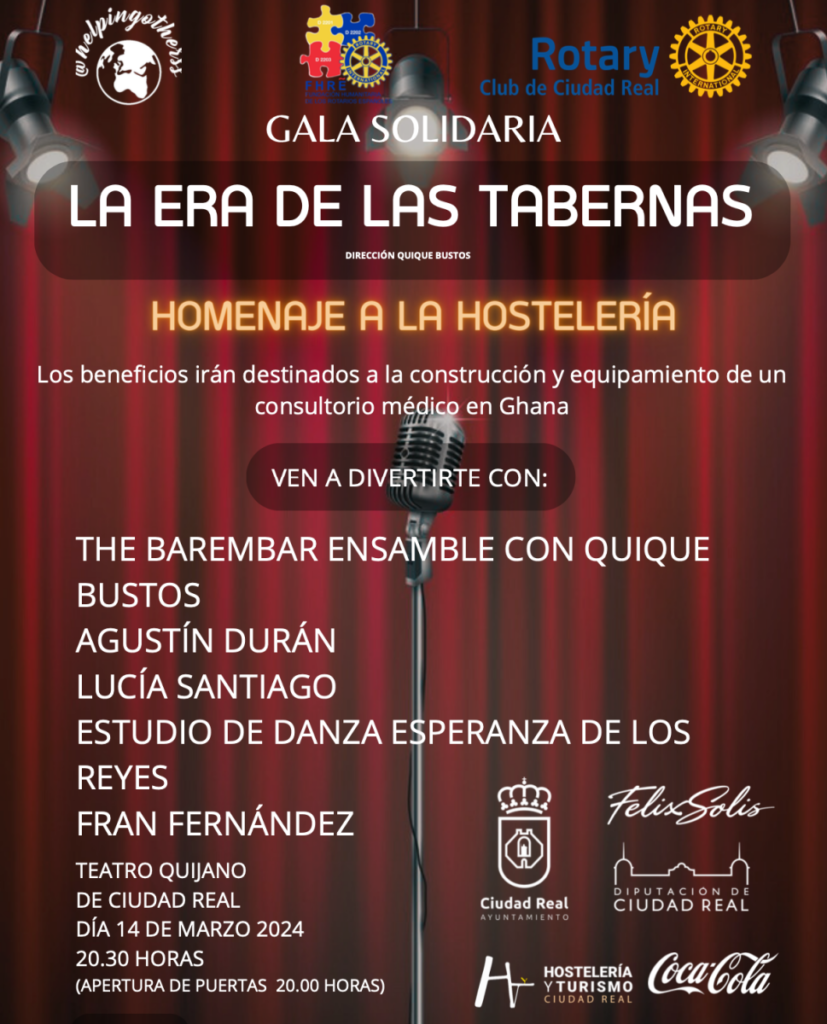 El Rotary Club de Ciudad Real, en colaboración con la ONG Helping Others, celebrará el próximo 14 de marzo en el Teatro municipal Quijano la gala solidaria “La era de las tabernas”. El evento tiene el doble objetivo de servir como homenaje a la hostelería de la provincia y de recaudar fondos destinados a financiar la creación de un consultorio médico en el poblado de Bongo Feo, en la periferia de la ciudad de Bolgatanga, en Ghana. La gala cuenta con la colaboración de la Concejalía de Cultura del Ayuntamiento de Ciudad Real.