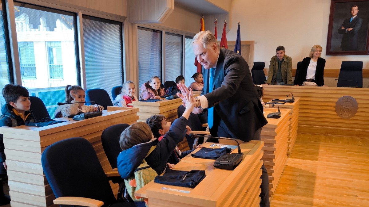 El alcalde de Ciudad Real, Francisco Cañizares, y la concejal de Educación, Maria José Escobedo, junto a otros concejales, entre ellos, Mar Sánchez, Luis Alberto Marín y Eva Masías, han compartido con los escolares los sillones del salón de Plenos y han respondido a cada una de las preguntas que les han planteado los más pequeños.
