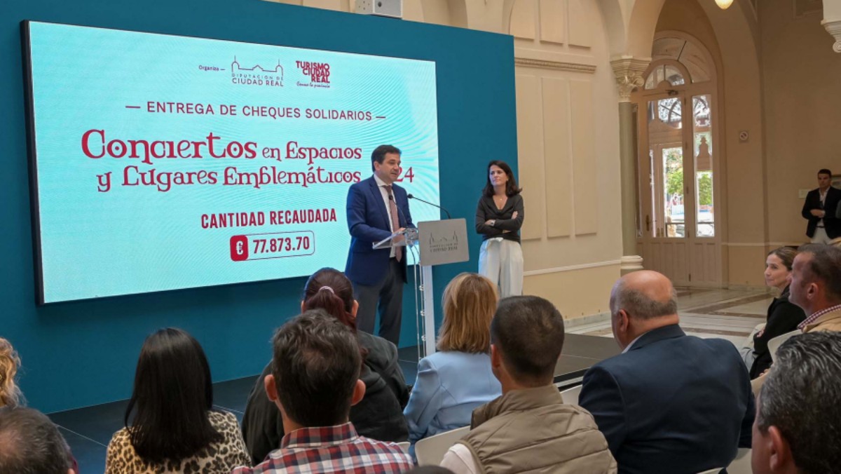 El presidente de la Diputación de Ciudad Real, Miguel Ángel Valverde, y la vicepresidenta quinta, María Jesús Pelayo, han presidido este martes el acto de entrega de los cheques solidarios a las quince asociaciones de la provincia que que este año se benefician de la recaudación obtenida a con el desarrollo de la actividad ‘Conciertos en Espacios y Lugares Emblemáticos’, que ha ascendido a 77.873 euros.
