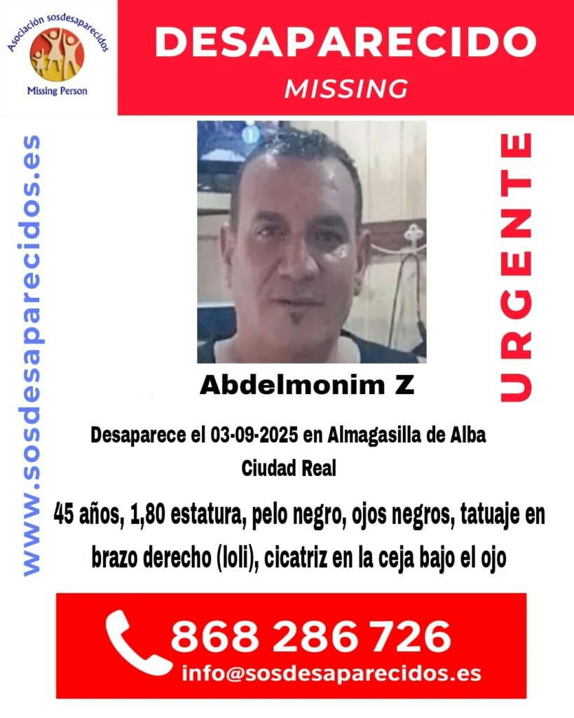La Asociación SOS Desaparecidos ha emitido una alerta urgente para localizar a Abdelmonim Z, un hombre de 45 años desaparecido el pasado 3 de septiembre de 2025 en la localidad de Almagasilla de Alba (Ciudad Real).