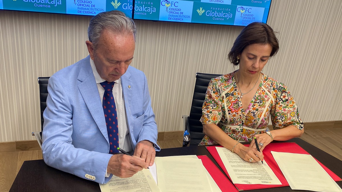 La Fundación Globalcaja Cuenca colaborará con el Colegio de Farmacéuticos en la realización de actividades de carácter formativo, de difusión y estudio de nuevos conocimientos. Éste es el objeto del convenio anual que ambas entidades han renovado, tras dos años de inactividad debido a la pandemia. suscrito por el presidente de la Fundación, Carlos de la Sierra, y la presidenta de la organización colegial, María Luz Moya.