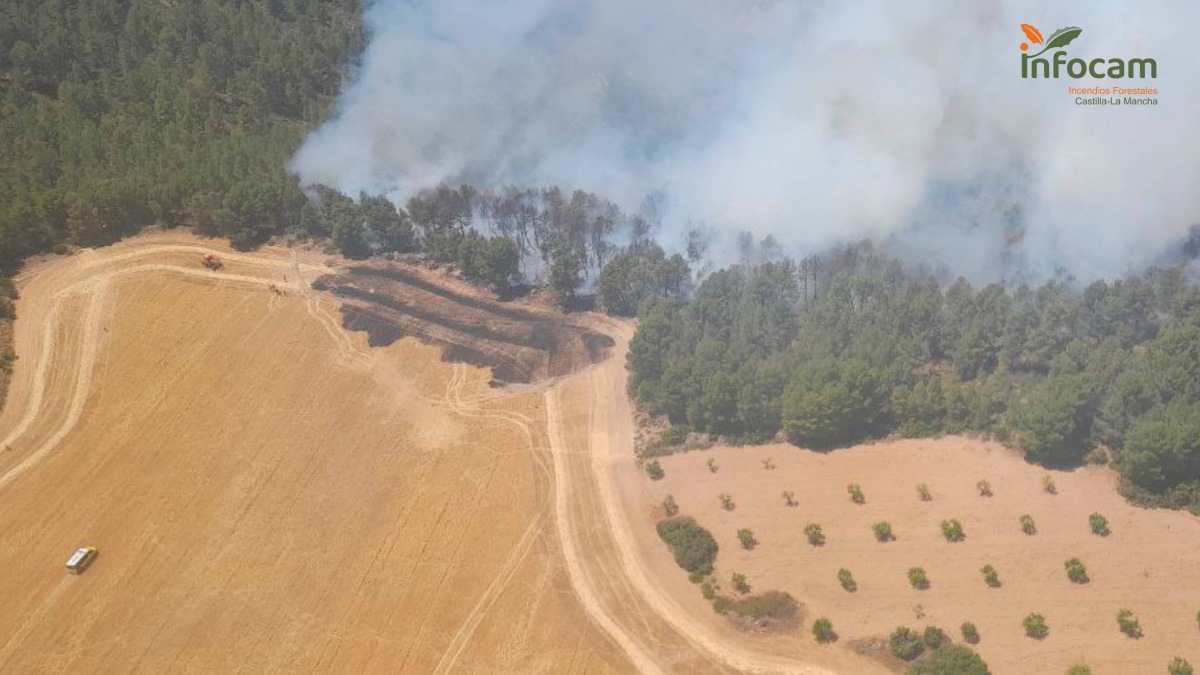 En el incendio de Bascuñana de San Pedro trabajan en su control, desde las 14:57 horas, un total de 59 efectivos, con tres medios aéreos y diez medios terrestres.