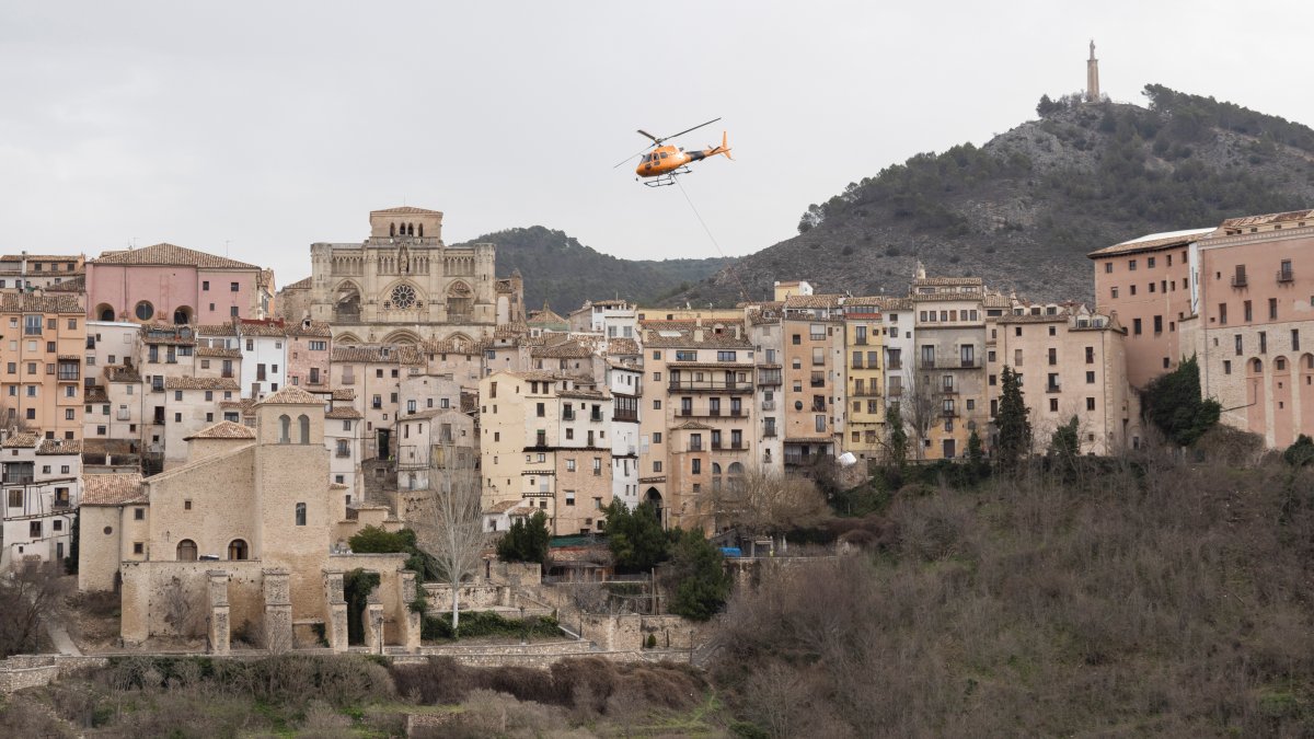 Un helicóptero retira, desde primeras horas de este martes, más de 83 toneladas de escombros procedentes de las obras de rehabilitación en la iglesia de San Miguel, en el casco antiguo de Cuenca, debido a que no era posible acceder con vehículos pesados hasta el lugar, en la Hoz del río Júcar.