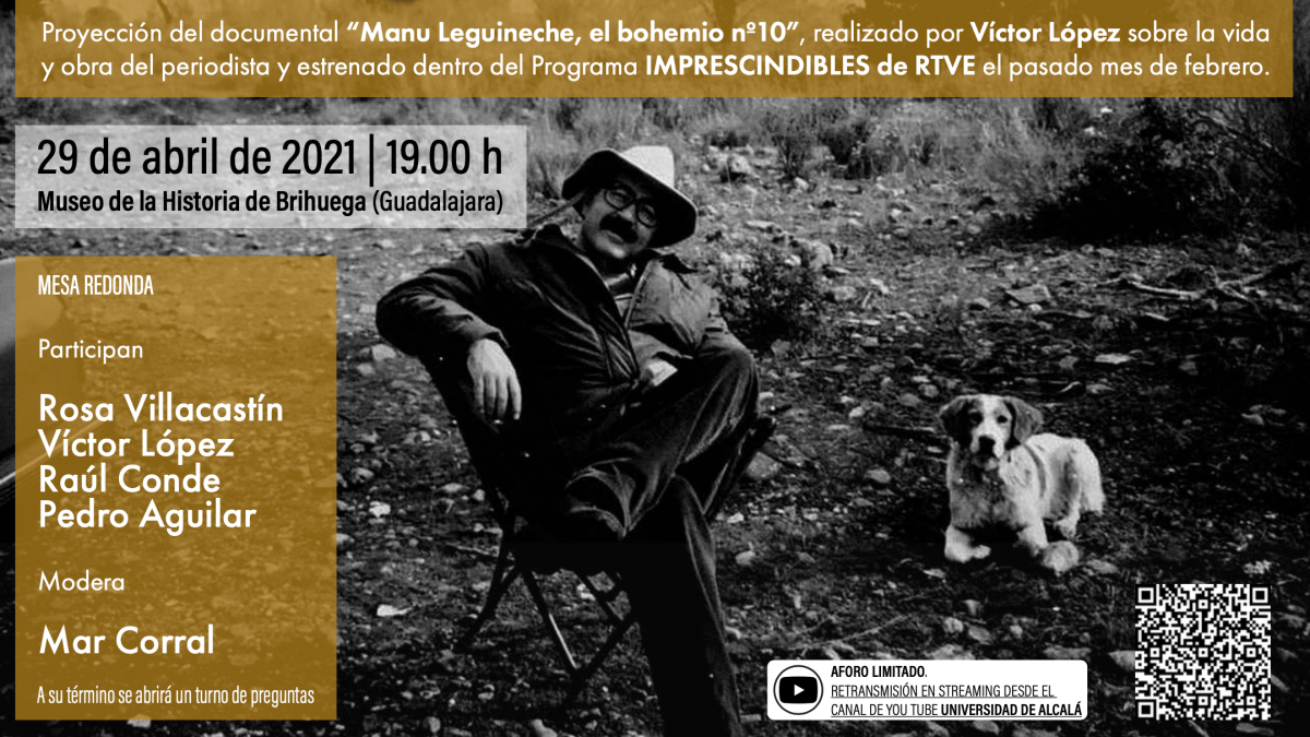 El próximo día 29 de abril, jueves, a las 19 h, se proyectará en el Museo de la Historia de Brihuega el documental «Manu Leguineche, el bohemio nº 10», sobre la vida y obra del recordado periodista afincado en sus últimos años en la villa briocense. El acto, que contará con la participación de reconocidos periodistas en una mesa redonda, será retransmitido en streaming desde el canal de YouTube de la Universidad de Alcalá.