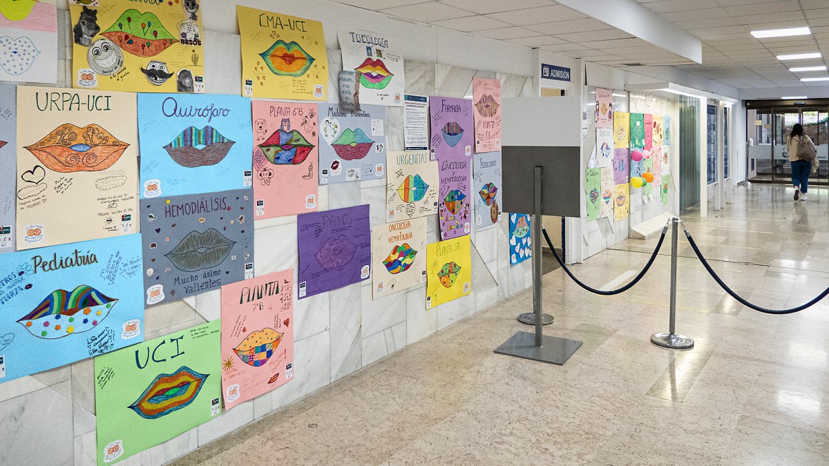 Desde el pasado domingo, y con la colaboración de los profesores del Equipo de Atención Hospitalaria y Domiciliaria (Aula Hospitalaria La Pecera), se han ido repartiendo por las unidades del Hospital carteles “captadores de besos”. Los profesionales estaban invitados a escribir, dibujar o pegar sus mensajes, besos o dibujos en estos carteles. Todos estos carteles se han llevado al vestíbulo de acceso al Hospital para que puedan ser contemplados por profesionales y usuarios.