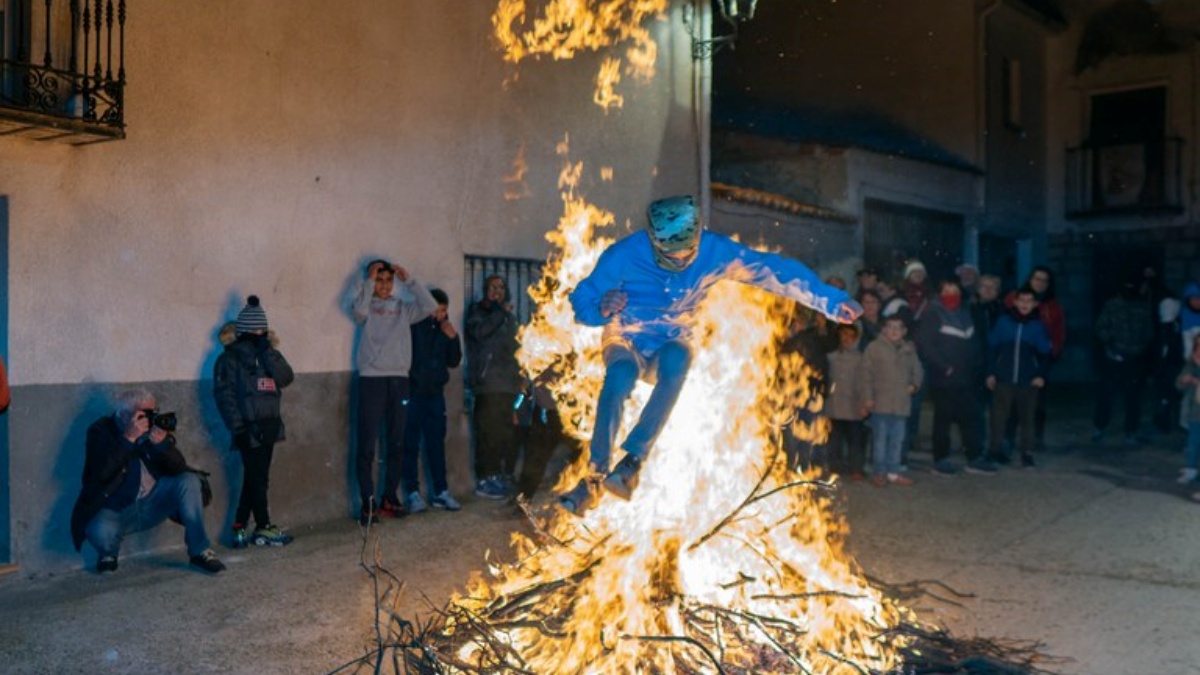 Personas, jóvenes en su mayoría, desafían las llamas en un rito que, desde tiempos ancestrales en Horche, persigue la purificación del cuerpo y el alma de los participantes, buscando la limpieza de los pecados y, al mismo tiempo, la bendición.