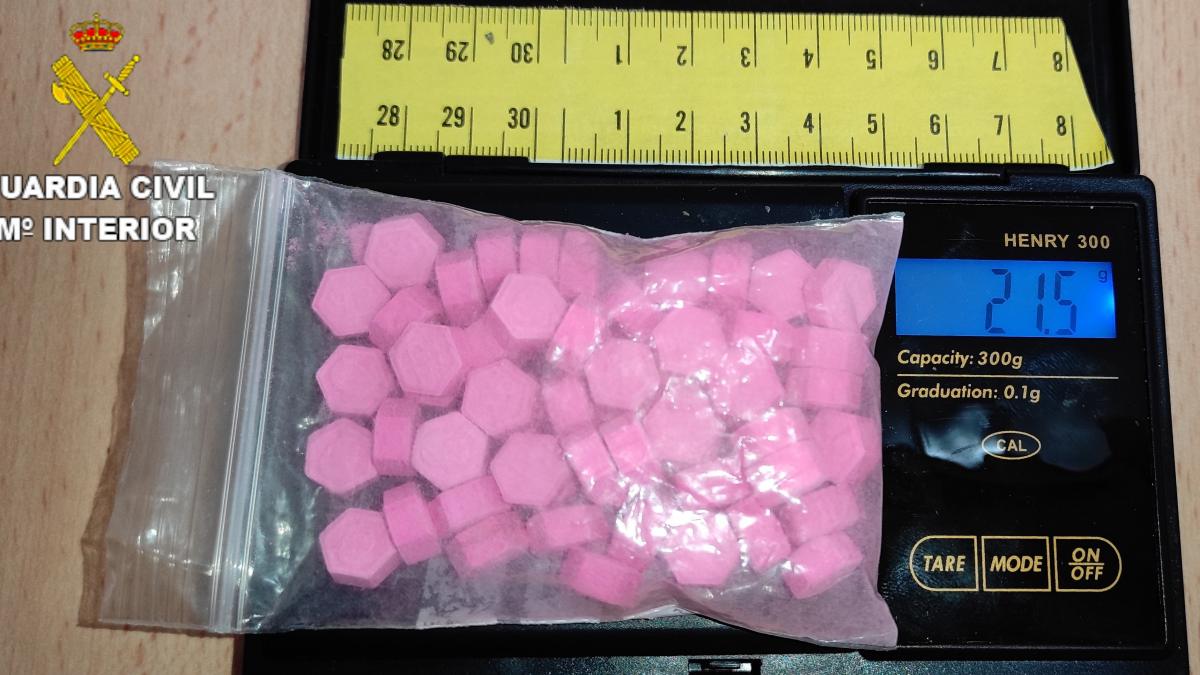 Realizado una somera inspección entre los objetos que portaban, fue encontrado un paquete envuelto en papel film transparente, que contenía tres bolsas, la primera de ellas con 60 comprimidos de anfetaminas (con un peso de 21,5 gramos), otra con polvo blanco (aproximadamente con 8,9 gramos de ketamina), y una última con polvo rosa (aproximadamente 43,2 gramos de mezcla) comúnmente conocida con el nombre de cocaína rosa, motivo por el que al verificar que se trataba de sustancias estupefacientes, se procedió a la detención de esta persona, un hombre de 34 años de edad por la comisión de un supuesto delito contra la salud pública, desgrana Guardia Civil.