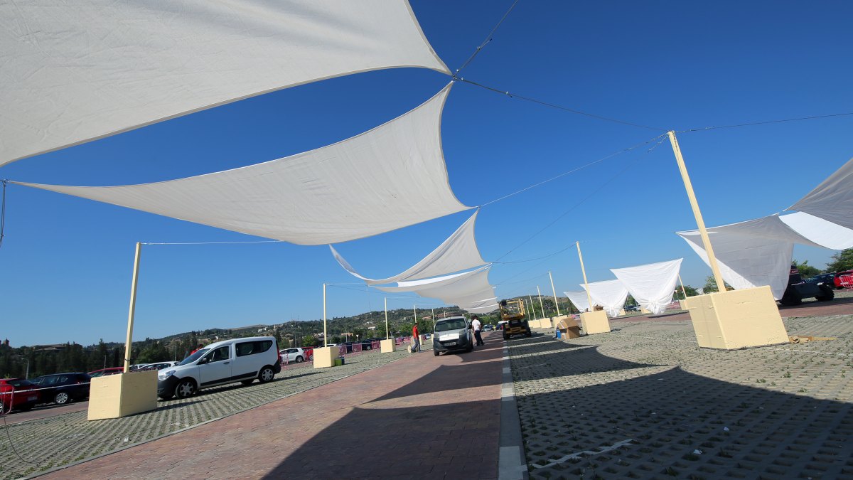 Una vez solventadas las cuestiones técnicas ligadas a este espacio, se ha optado por instalar un total de 21 pilares que ubicados de tres en tres cubren un espacio de dos calles y 600 metros cuadrados de sombra gracias a los toldos que penden de ellos.