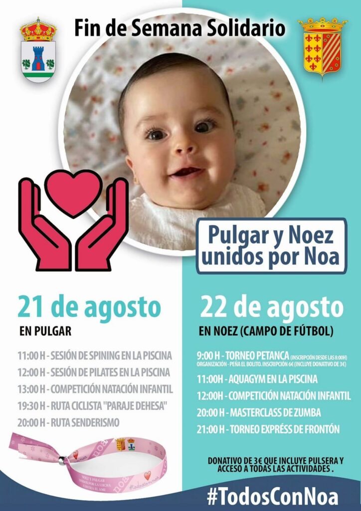 Esta pequeña vecina de Pulgar (Toledo) ha conseguido numerosos apoyos y los municipios toledanos de Noez y Pulgar van a celebrar el próximo 21 de agosto un fin de semana solidario con infinidad de actividades para apoyar a Noa. Además, el PP de Pulgar destinará toda la recaudación de la Lotería de Navidad también a esta causa solidaria.